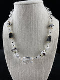 Quartz Crystal Focal Stone, Black Tourmaline, Lamp Glass, Swarovski Crystal, Seed Beads, Quartz Crystal Chips, Sterling Stardust Beads, Sterling Clasp.